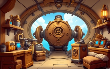 OKCJ, A bustling digital illustration of a steampunk airship interior in cartoon style, flooded with copper-toned gaslight. Gear-laden control panels surround a central brass engine, with goggled pilots adjusting pressure gauges. Luggage nets hold trunks and mechanical owls, while portholes reveal fluffy clouds outside. The air crackles with industrial energy.