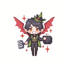 XSRW, Chibi-style drawing of a mischievous imp with small, red wings and a pointed tail. He is wearing a green and black outfit with a small hat. He holds a pitchfork in one hand and a bag of tricks in the other. The background is plain white. The art style is pixel art with a simple, cute aesthetic. The imp has a grinning face and mischievous, glowing eyes.