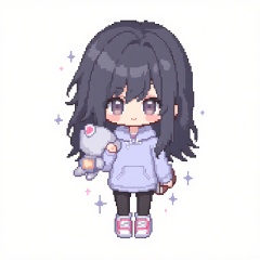 XSRW, Chibi-style drawing of a shy girl with long, black hair and bangs covering her eyes. She is wearing a light purple hoodie, black leggings, and pink sneakers. She holds a stuffed animal in one arm and a book in the other hand. The background is plain white. The art style is pixel art with a simple, cute aesthetic. The girl has a soft, timid smile and a blush on her cheeks.