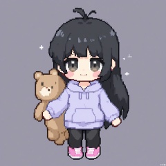 XSRW, Chibi-style drawing of a shy girl with long, black hair and bangs covering her eyes. She is wearing a light purple hoodie, black leggings, and pink sneakers. She holds a stuffed animal in one arm and a book in the other hand. The background is plain white. The art style is pixel art with a simple, cute aesthetic. The girl has a soft, timid smile and a blush on her cheeks.