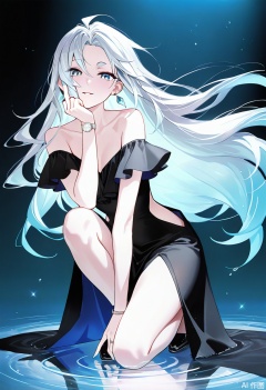 masterpiece, best quality, amazing quality, highres, 1girl, long silvery hair with sleek side - swept waves, perfect body proportions, black velvet off - shoulder gown with flowing train (fabric cascades elegantly), seductive pose: half - crouching on glossy water surface, body leaning forward, left forearm resting on knee for support, right hand fingertips grazing water (ripples emanate), head tilted slightly with intense half - lidded eyes locking gaze with viewer, diamond - encrusted drop earrings, delicate wristwatch on left wrist, slim ring on right middle finger, moody blue - hued studio background with faint misty glacier silhouette, soft spotlight illuminating figure (casts sharp shadows on water/backdrop), water surface mirrors silvery hair strands + gown folds, anime - style bold line art, detailed textures (velvet softness, water ripples, hair sheen), color harmony of cool silver hair & dark gown & icy blue backdrop, cinematic low - angle shot emphasizing body curve + reflection interaction, elegant yet provocative atmosphere with subtle tension,qing,perfect figure,(solo:1.2)