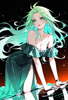 masterpiece, best quality, highres, ultra - detailed, 1girl, long green wavy hair with glossy highlights, perfect body proportions, black off - shoulder satin gown with elegant drapery, crawling pose (body leaning forward, hands gently touching reflective water - like surface, fingers slightly spread), cool - toned blue gradient background, dramatic side lighting (illuminating skin, hair strands, and gown texture), reflection of hands and gown visible on the surface, diamond earrings, wristwatch, delicate ring, intense piercing gaze, bold red lips, anime style (bold line art, vibrant color contrast between warm tones of skin/hair and cool background), detailed fabric (satin sheen, natural folds of the gown), cinematic composition emphasizing body silhouette and reflective elements,qing,perfect figure,(solo:1.2),green hair