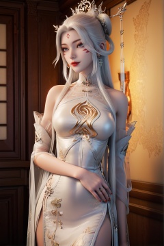 score_9,score_8 up,score_7,1girl,solo,3d,ultra-detailed,high resolution,perfect lighting,flawless skin,sharp focus,extremely detailed anatomy,Exquisite Craftsmanship,High-Resolution Beauty,Unparalleled Artistic Quality,(masterpiece:1.2),best quality,official art,extremely detailed CG unity 8k wallpaper,<lora:小白-诛仙:0.7>,bare shoulders,chinese clothes,dress,eye focus,facial mark,grey eyes,hair ornament,indoors,long hair,parted bangs,red lips,red nails,white dress,