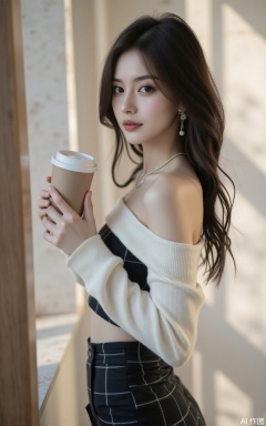 1girl,solo,skirt,off shoulder,off-shoulder sweater,jewelry,white sweater,necklace,cup,bare shoulders,holding,sweater,disposable cup,breasts,black skirt,plaid skirt,collarbone,plaid,blurry background,crop top,holding cup,blurry,midriff,long sleeves,large breasts,