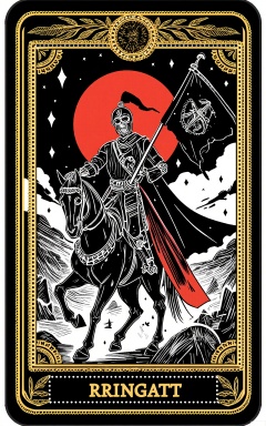TLPF, A digital illustration in a gothic, vintage style featuring a skeletal knight in a suit of armor made of Tarot cards, riding a spectral horse. The knight is holding a sword with a skull-shaped hilt in one hand and has a banner with a dark emblem fluttering behind. The background is a desolate, war-torn battlefield with smoke rising from the ruins and a large, blood-red sun setting. The Tarot card armor is intricately detailed with scenes of battle and honor. The overall color scheme is dark with red and silver accents. The image is framed by a decorative border with sword and shield designs.