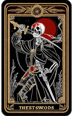 TLPF, A digital illustration in a gothic, vintage style featuring a skeletal knight in a suit of armor made of Tarot cards, riding a spectral horse. The knight is holding a sword with a skull-shaped hilt in one hand and has a banner with a dark emblem fluttering behind. The background is a desolate, war-torn battlefield with smoke rising from the ruins and a large, blood-red sun setting. The Tarot card armor is intricately detailed with scenes of battle and honor. The overall color scheme is dark with red and silver accents. The image is framed by a decorative border with sword and shield designs.