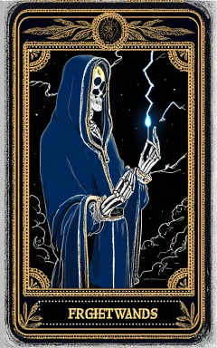 TLPF, A digital illustration in a gothic, vintage style featuring a skeletal sorcerer in a long, blue robe with silver stars, standing in front of a giant, floating Tarot card. The sorcerer is casting a spell with one hand and has a glowing, magical tome in the other. The background is a stormy, night sky filled with lightning and dark clouds, with a large, mysterious portal in the distance. The Tarot card is glowing with arcane energy and depicts a scene of magic and transformation. The overall color scheme is dark with blue and silver accents. The image is framed by a decorative border with spellbook and wand designs.