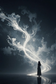 In the dark world, a light - haired woman stands. Light trails wind like memory threads. She lowers her eyes, her figure gently wrapped by light and shadow, with the reflection elongating loneliness. In the interweaving of light and shadow, her silent emotions towards the world are hidden, quiet and profound...jzbj,Mirror-reflective Background,Ink Wash Painting
