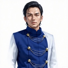 looking at viewer,Sarome Seijin,uniform, military uniform, pants, jacket,chain-link, blue jacket, blue coat,white gloves, military