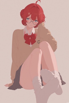 masterpiece,best quality, amazing quality,newest,absurdres,highres,very awa, danjin, danjin\(wuthering waves\), solo,1girl, school_uniform, long sleeves, braid buns, earrings, red hair, sitting, black round glasses, pout, tsunderia, official_art, red bowtie, side lighting,white socks, simple_background,cute,full_body, foot_focus,
