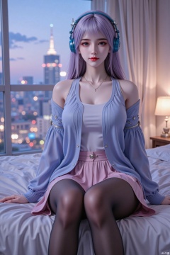 Masterpiece, the best quality, high quality, huge breasts,,(white hair:1.4),(long legs:1.3),(thin legs:1.4),nakano miku,depth of field,light particles,lens flare,(artist:quasarcake:0.8),extreme aesthetic,(wlop:0.6),wanke,rella,wanke,masterpiece,best quality,good quality,newest,year 2024,year 2023,very aesthetic,absurdres,Visual impact,Electromotive force,perspective composition,A shot with tension,ultra-high resolution,32K UHD,sharp focus,best quality,masterpiece,Emotionalization masterpiece,unconventional supreme,masterful details,with a high end texture,in the style of fashion photography,(Visual impact:1.2),giving the poster a dynamic and visually striking appearance,impactful picture,offcial art,colorful,splash of color,movie perspective,masterpiece,best quality,amazing quality,very aesthetic,absurdres,best quality,newest,best quality,good,1girl,brown hair,hair between eyes,aqua eyes,on the bed,one-piece black stockings,not wearing shoes,sheer black stockings,shy,white shirt,blue headphones,hair tangled in headphones,pink skirt,morning,city outside the window,home bedroom,sitting like a duck,light blue wool sweater,taking off the coat,sexy,full_shot,looking_at_viewer,from_back,face_focus,eyes_focus,solo_focus,