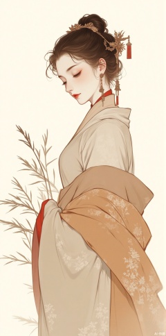 1girl, solo, brown hair, black hair, hair ornament, long sleeves, jewelry, closed mouth, closed eyes, upper body, earrings, wide sleeves, hair bun, from side, profile, makeup, chinese clothes, plant, shawl, branch, red lips, hanfu