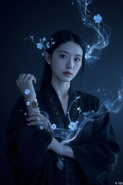 In the eerie blue glow of magic, ankle - length raven hair is twined with glowing vines. Her pale face gleams coldly, and her vertical purple pupils swirl with mysterious light. A black robe embroidered with silver runes flickers in and out of the light. As she raises her hand to summon the light and shadow, an ancient totem on her wrist is revealed as her sleeve slides down, filling the air with an unfathomable aura.