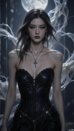 Under the cold moonlight, long hair with silver - gray highlights cascades like a waterfall. Her angular face is sculpted into a stern silhouette by the light and shadow. Ice - blue eyes under smoky makeup seem to hold stars within. She wears a black leather corset dress, and metallic chain decorations glimmer in the light. Flowing light and shadow twine around her slender fingers, casting a fragmented and sharp shadow behind her—mysterious and stunningly cold.