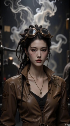 In the searchlight beams of a factory, a woman with dreadlocks stands amidst mechanical gears. Her dreadlocks are twined with copper chains and gear decorations. Her bronze - toned skin glows healthily, and her deep brown eyes are as sharp as an eagle’s. Dressed in a tan leather work uniform, her shoulders and elbows are studded with rivets and protective plates, and goggles shaped like a pocket watch hang from her chest. Light and shadow crisscross over her, illuminating the oil stains on her face and her determined expression. Steam billows in the light, highlighting the gritty allure of the industrial age.jzbj,Mirror-reflective Background,digital-art