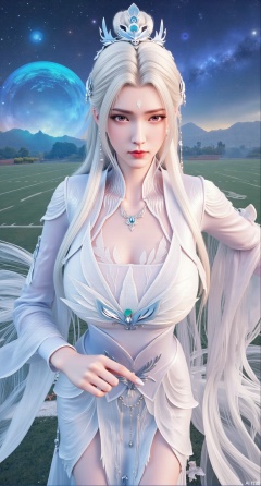 (masterpiece, best quality:1.2), A celestial goddess with long, flowing white hair adorned with jade ornaments, clad in a sheer, cloud-patterned hanfu that shimmers with a soft glow. She wields a golden guqin, her eyes serene and otherworldly. Behind her, a backdrop of floating islands and swirling galaxies. Vivid, vibrant colors, dynamic brush strokes, typical Chinese animation art style, high contrast, 8K resolution.,(huge breasts:2.99), (full breasts:2.99),background, solo, makeup,(The background is the school playground, Sitting on the grass on the football field:1.39),Xqianqianmeinu,Xmoxionghanfu,Xleisiqipao,Xxeushengxiaofu,Xxiajixiaofu,Xzileisiqipao,XluxueqiXY2,Xyaoyuexianzi