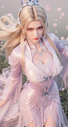 (masterpiece, best quality:1.2), A graceful flower goddess with long, golden hair, wearing a pastel pink hanfu adorned with blooming peonies. She floats in a field of flowers, surrounded by a gentle breeze that carries petals. Her expression is kind and serene. Soft colors, flowing lines, floral motifs, dreamy atmosphere,(huge breasts:2.99), (full breasts:2.99),Xqianqianmeinu,Xmoxionghanfu,Xleisiqipao,Xxeushengxiaofu,Xxiajixiaofu,Xzileisiqipao,XluxueqiXY2,Xyaoyuexianzi