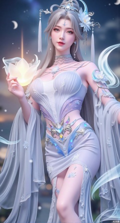 (masterpiece, best quality:1.2), A dreamy celestial goddess with long, silvery-white hair that flows like liquid moonlight. She wears a sheer, iridescent hanfu adorned with floating clouds and glowing stars, the fabric shimmering with every gentle movement. Her eyes sparkle like distant galaxies, and she holds a glowing lotus lantern, surrounded by a mist of iridescent particles. Soft pastel colors, flowing lines, magical atmosphere, 8K resolution.,(huge breasts:2.99), (full breasts:2.99),Xqianqianmeinu,Xmoxionghanfu,Xleisiqipao,Xxeushengxiaofu,Xxiajixiaofu,Xzileisiqipao,XluxueqiXY2,Xyaoyuexianzi