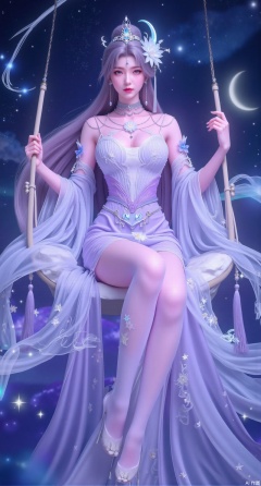 (masterpiece, best quality:1.2),An enchanting goddess with long, lilac hair that flows like a gentle stream. She dons a sheer, lavender hanfu with delicate lace and embroidery of glowing moons and stars. She sits on a floating, crystal swing in the middle of a starry night sky, surrounded by a galaxy of twinkling lights. Soft, pastel purples, glowing effects, cosmic atmosphere, 8K quality..(huge breasts:2.99), (full breasts:2.99),Xqianqianmeinu,Xmoxionghanfu,Xleisiqipao,Xxeushengxiaofu,Xxiajixiaofu,Xzileisiqipao,XluxueqiXY2,Xyaoyuexianzi