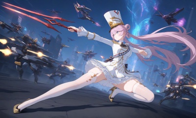 masterpiece,high score,great score,absurdres,dramatic mid-air combat stance,cyberpunk cityscape at night,<lora:moli1:1>,moli,thighhighs,hat,long hair,blue eyes,white thighhighs,full body,garter straps,shako cap,double bun,dress,pink hair,hair bun,long sleeves,bangs,white dress,very long hair,closed mouth,purple hair,double-breasted,frills,buttons,epaulettes,white headwear,wielding Longinus Spear (divine weapon),thrusting towards robotic enemy,electric arcs crackling along spear shaft,sacred geometry patterns illuminating,pink and purple gradient hair whipping violently,blue eyes focused,mechanical debris falling from sky,shattered robot chassis exploding,other drones firing laser volleys,neon rain slicking reflective streets,towering holographic billboards flickering,flying vehicles evading combat zone,spear tip piercing through robot armor,molten metal splattering,motion-blurred energy trails,volumetric light beams from skyscrapers,low camera angle,dynamic perspective,cinematic composition,cyber-rainstorm with glowing droplets,atmospheric turbulence,battle damage effects,overcharged energy core detonation in background,Lance of Longinus,spear,