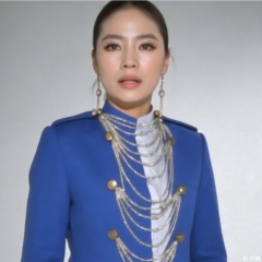 cross necklace, jacket, shorts, choker,earrings,chain-link,jewelry,blue jacket,blue coat,uniform,white footwear,necklace,boots,skirt,white gloves,jjmx