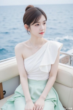 The image shows a young woman sitting on a cushioned seat with a serene ocean view in the background. She is dressed in a stylish outfit consisting of a one-shoulder white top and a light green skirt. Her hair is styled in a neat bun, and she is wearing a delicate necklace with a small pendant. The setting appears to be outdoors, possibly on a boat or near the water, with calm waves visible in the background. The overall atmosphere is relaxed and tranquil.