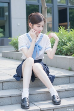 The image shows a young woman sitting on a set of stone steps outdoors. She is wearing a white short-sleeved blouse with a blue bow tie and a pleated navy blue skirt. Her legs are crossed, and she is wearing black loafers and white socks. Her hair is tied back in a ponytail, and she appears to be adjusting it with one hand. The background includes a building with large windows and some greenery, suggesting an urban or suburban setting. The lighting is bright, indicating it might be daytime.