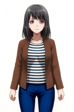looking at viewer,Tsukishima Marina,1girl, shirt, striped, black hair, jacket, brown eyes, bangs, red eyes, medium hair, striped shirt, jeans