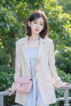 The image shows a young woman standing outdoors, leaning against a railing. She is dressed in a light-colored, long-sleeve jacket over a light blue dress. Her outfit is complemented by a pink crossbody bag. The background consists of lush green foliage, suggesting a park or garden setting. The lighting is soft and natural, creating a serene and pleasant atmosphere.