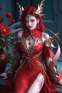 score_9,score_8_up,score_7_up,<lora:wy_xueyaonvwang_XL7.0:0.8>,1girl,earrings,jewelry,red hair,solo,red dress,tattoo,long hair,breasts,dress,colored skin,hair ornament,clothing cutout,detached sleeves,teeth,pale skin,yellow eyes,dark,wetting,thick_thighs,sitting,flower,many flowers,very many flowers,on_ground,from_above,