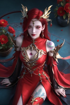 score_9,score_8_up,score_7_up,<lora:wy_xueyaonvwang_XL7.0:0.8>,1girl,earrings,jewelry,red hair,solo,red dress,tattoo,long hair,breasts,dress,colored skin,hair ornament,clothing cutout,detached sleeves,teeth,pale skin,yellow eyes,dark,wetting,thick_thighs,sitting,flower,many flowers,very many flowers,on_ground,from_above,