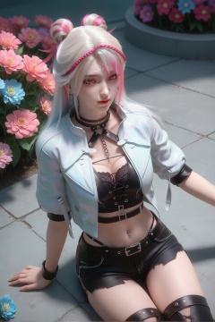 score_9,score_8_up,score_7_up,<lora:wy_xiaocheng_XL7.0:0.8>,1girl,long hair,breast,medium breasts,earrings,hair_ornament,dress,pink eyes,thick_thighs,flower,many flowers,very many flowers,wetting,dark,sitting,on_ground,from_above,multicolored hair,jacket,pink hair,navel,navel piercing,white hair,midriff,streaked hair,cropped jacket,shorts,black pants,open jacket,open clothes,white jacket,crop top,hair bun,choker,forehead mark,