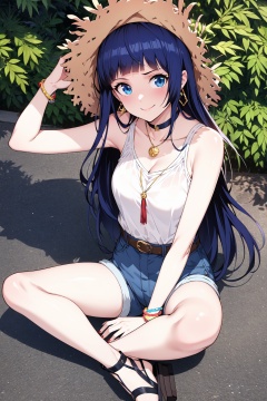 <lora:01熏儿漫画第一版:1>,1girl,solo,breasts,long hair,blue eyes,jewelry,shorts,hat,smile,cleavage,sitting,bangs,looking at viewer,choker,bracelet,sandals,belt,blue hair,straw hat,blunt bangs,outdoors,earrings,denim shorts,denim,short shorts,hand on headwear,blue shorts,collarbone,closed mouth,day,large breasts,shirt,indian style,from above,medium breasts,sleeveless,pendant,sun hat,white shirt,bare shoulders,full body,