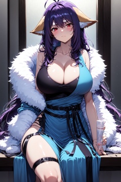 <lora:01涂山雅雅第一版:1>,1girl,breasts,large breasts,long hair,solo,animal ears,cleavage,sitting,looking at viewer,dress,blue dress,purple hair,sash,blush,ahoge,bangs,collarbone,thigh strap,closed mouth,sleeveless,very long hair,bare shoulders,thighs,hair between eyes,antenna hair,indoors,red eyes,arm support,frown,belt,brown eyes,side slit,