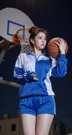 (masterpiece, best quality:1.2), A girl with her hair in a low bun wears a blue and white sports school uniform, a delicate school emblem brooch pinned to the collar. Standing on the moonlit campus basketball court, she holds a basketball, ready to shoot. Snow accumulates on the surrounding basketball hoops and horizontal bars, and the moonlight casts a silver glow around her figure. Cold moonlight, quiet night, soft shadows.(huge breasts:2.99), (full breasts:2.99),Xqianqianmeinu,Xmoxionghanfu,Xleisiqipao,Xxeushengxiaofu,Xxiajixiaofu,Xzileisiqipao,XluxueqiXY2,Xyaoyuexianzi,XteYK,Xdongjixiaofu2,Xclaudmonetstyle,XLiquidGlassMaterial,Xclaudmonet