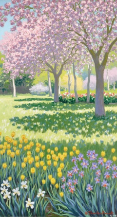 (masterpiece, best quality:1.2),A scene of a spring garden in the style of Monet, with various flowers blooming brightly. Pink cherry blossoms, purple irises, and yellow tulips blend together. Sunlight filters through the gaps in the leaves, creating dancing spots of light on the grass. Light brushstrokes depict the softness of the petals and the gentle breeze, with bright and layered colors, showing the vitality of spring.Xqianqianmeinu,Xmoxionghanfu,Xleisiqipao,Xxeushengxiaofu,Xxiajixiaofu,Xzileisiqipao,XluxueqiXY2,Xyaoyuexianzi,XteYK,Xdongjixiaofu2,Xclaudmonetstyle,XLiquidGlassMaterial,Xclaudmonet