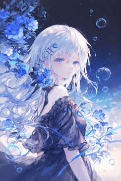 1girl, solo, long hair, looking at viewer, bangs, blue eyes, hair ornament, dress, ribbon, hair between eyes, bare shoulders, closed mouth, upper body, flower, white hair, hairclip, off shoulder, black dress, from side, bubble, blue flower, off-shoulder dress