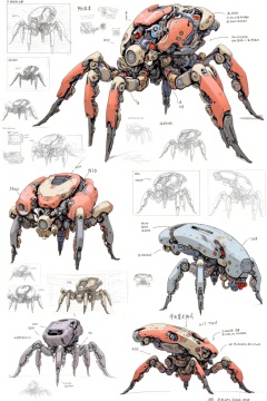The image depicts a variety of robotic spiders, each with distinct designs and features. The robots are shown in different stages of development, from sketches to fully detailed models. They vary in size, color, and mechanical components, such as legs, eyes, and body structures. Some robots have a more organic look, resembling natural spider forms, while others have a more mechanical and industrial appearance. The sketches include annotations for each model, listing specific details like "N10" and "1003," which likely refer to model numbers or identifiers. The overall theme is focused on creating a diverse range of robotic spiders, possibly for use in a science fiction or futuristic setting.