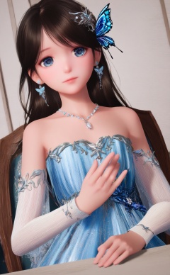 masterpiece,very aware,highres,absurdres,newest,best quality,loli,petite,high quality,chromatic_aberration,//,nuannuan,1girl,jewelry,dress,necklace,earrings,solo,dutch_angle,long_hair,blue_dress,hair_ornament,butterfly,bug,bare_shoulders,chair,brown_hair,blue_eyes,black_hair,upper_body,strapless_dress,detached_sleeves,//,realistic,//,<lora:nuannuan2——【noob】hans:1>,