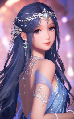 masterpiece,very aware,highres,absurdres,newest,best quality,loli,petite,high quality,chromatic_aberration,//,nuannuan,1girl,long_hair,jewelry,hair_ornament,earrings,solo,blurry,looking_at_viewer,beads,gem,dress,looking_back,blurry_background,smile,shawl,see-through,pearl_\(gemstone\),blue_eyes,backless_outfit,head_chain,hair_beads,purple_hair,bare_shoulders,very_long_hair,bug,bare_back,backless_dress,depth_of_field,bracelet,tiara,circlet,necklace,standing,realistic,lips,blue_dress,crescent,from_side,purple_eyes,blue_hair,armlet,skirt,from_behind,//,realistic,//,official art,depth of field,detailed light,blurry background,best shadow,shiny skin,cinematic lighting,ray tracing,amazing quality,very aesthetic,absurdres,beast quality,ultra detailed,newest,8K,HDR,<lora:nuannuan2——【noob】hans:1>,