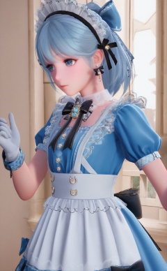 masterpiece,very aware,highres,absurdres,newest,best quality,loli,petite,high quality,chromatic_aberration,//,nuannuan,1girl,gloves,solo,blue_eyes,maid_headdress,white_gloves,maid,dress,blue_hair,jewelry,blue_dress,earrings,apron,short_sleeves,bow,virtual_youtuber,maid_apron,//,realistic,//,<lora:nuannuan2——【noob】hans:1>,