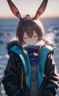 best, 1girl, solo, animal ears, amiya (arknights), closed eyes, rabbit ears, brown hair, long hair, blurry background, blue ascot, upper body, hands in pockets, blurry, breath, closed mouth, hair between eyes, ascot, open clothes, facing viewer, sidelocks, coat, black jacket, jacket, black coat, blue scarf, scarf, blush, outdoors, long sleeves, fur trim, open coat, hood, open jacket, hood down, shirt, depth of field, rabbit girl, grey shirt, hooded coat, buttons, hooded jacket, fur-trimmed coat, backlighting, fur-trimmed hood, frilled ascot, winter clothes, fur-trimmed jacket, very long hair, ponytail, winter coat, purple ascot, blue coat, day, cold<lora:amei3-000040:0.9>