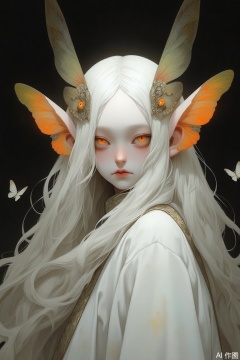 The image is a digital art piece that appears to be a portrait of a young woman with long white hair and orange eyes