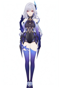 8k,best quality,masterpiece,(ultra-detailed),(high detailed skin),(by nanoless, by misumi \(macaroni\),:0.5),A full-body portrait of a young girl,standing gracefully,pastel art style,high-key lighting,shoujo manga influence,hd quality,delicate details,full body,full shot,standing,looking at viewer,(solo:1.2),simple background,(white background:1.2),<lora:sikknew-sd-Tanger-000019:0.85>,Skirk \(genshin impact\),clothes: balck halter bodysuit,official alternate costume,Skirk hair ornament,black alternate elbow gloves,1girl,long grey hair,thighhighs,red eyes,