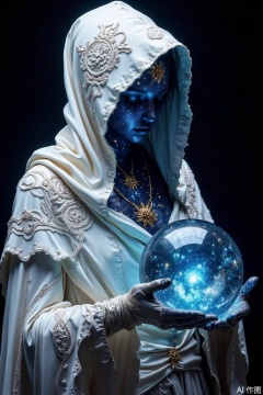 She is holding a crystal ball in her hands, which appears to be glowing with a blue light