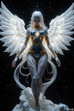 The background is black, with small white dots scattered throughout, giving the impression of a starry night sky. The angel is wearing a blue and gold outfit with a metallic sheen, and her body is covered in intricate patterns and designs