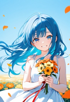 1girl,solo,flower,dress,smile,long hair,holding,holding flower,looking at viewer,white dress,blue hair,blue eyes,bangs,ribbon,yellow flower,grin,teeth,floating hair,bare shoulders,blue background,blue sky,red ribbon,sleeveless,multicolored eyes,sleeveless dress,orange flower,petals,sky,paul hedley