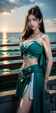 1girl, solo, long hair, , looking at viewer, skirt, hair ornament, bare shoulders, jewelry, , earrings, outdoors, midriff, water, necklace, lips, crop top, leaning forward, ocean, white skirt, strapless vest, sunset, sun,mupeiling