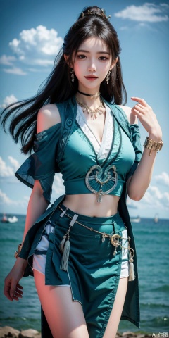 best quality, masterpiece, realistic,cowboy_shot,(Good structure), DSLR Quality,Depth of field,kind smile,looking_at_viewer,Dynamic pose, ,Short skirt,Blue sky, white clouds, ocean, nai3, 1girl, solo, crop top, , choker, navel, shirt, midriff, crop top overhang, looking at viewer, white shirt, jewelry, breasts, bare shoulders, off-shoulder shirt, off shoulder, black choker, thighs, stomach, long hair, bracelet, short sleeves, ribbon, hand up, collarbone, hair ribbon, medium breasts, , , hair ornament, thigh gap, necklace, expressionless,mupeiling