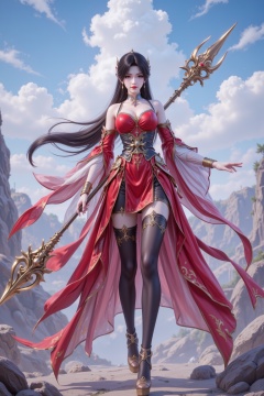 <lora:绚丽多彩·优化9:0.8>,lvjing,1girl,weapon,solo,long hair,thighhighs,jewelry,holding,holding weapon,polearm,sky,earrings,cloud,full body,black hair,breasts,outdoors,black thighhighs,dress,looking at viewer,red dress,high heels,detached sleeves,holding polearm,standing,spear,garter straps,5,